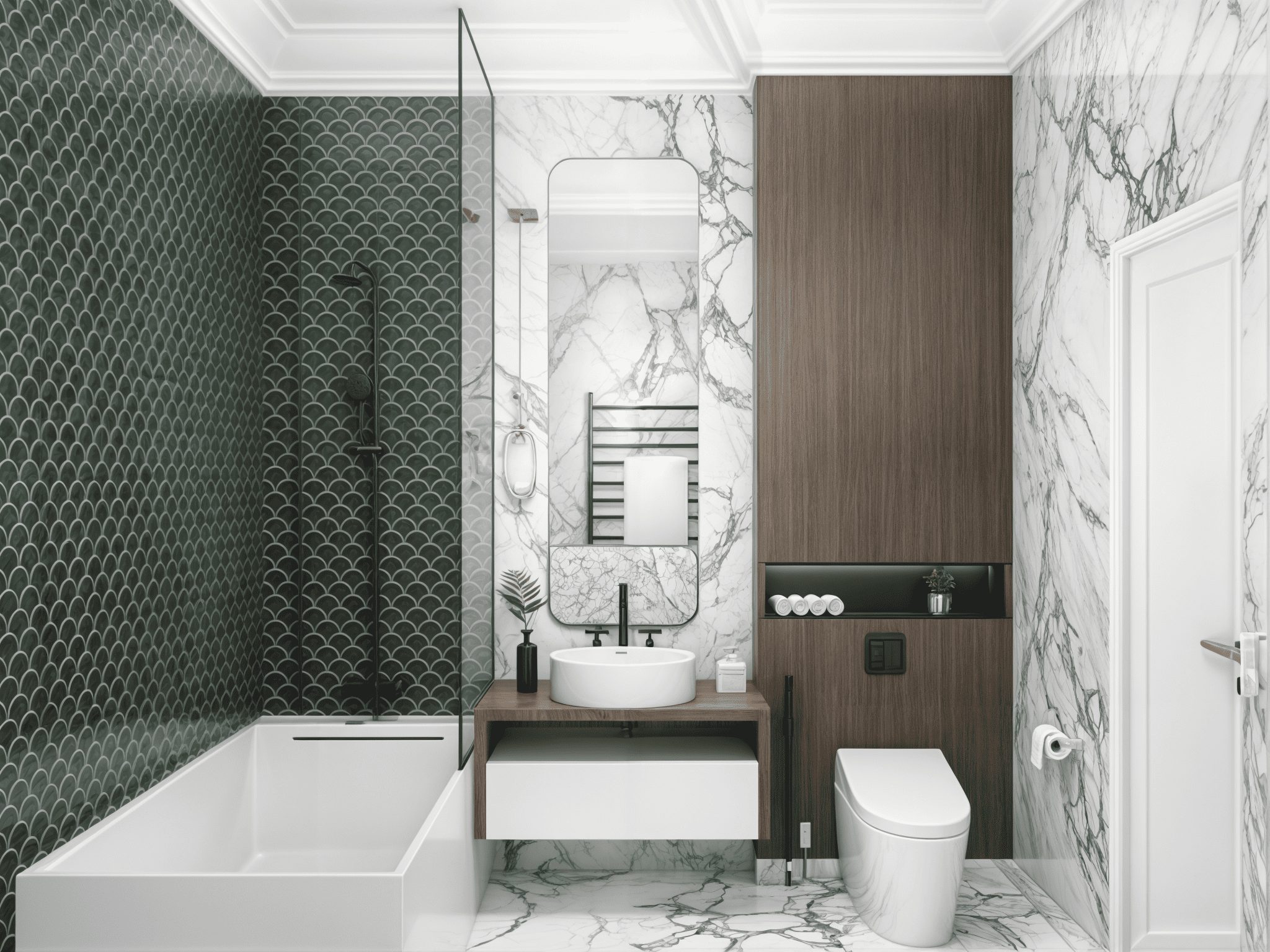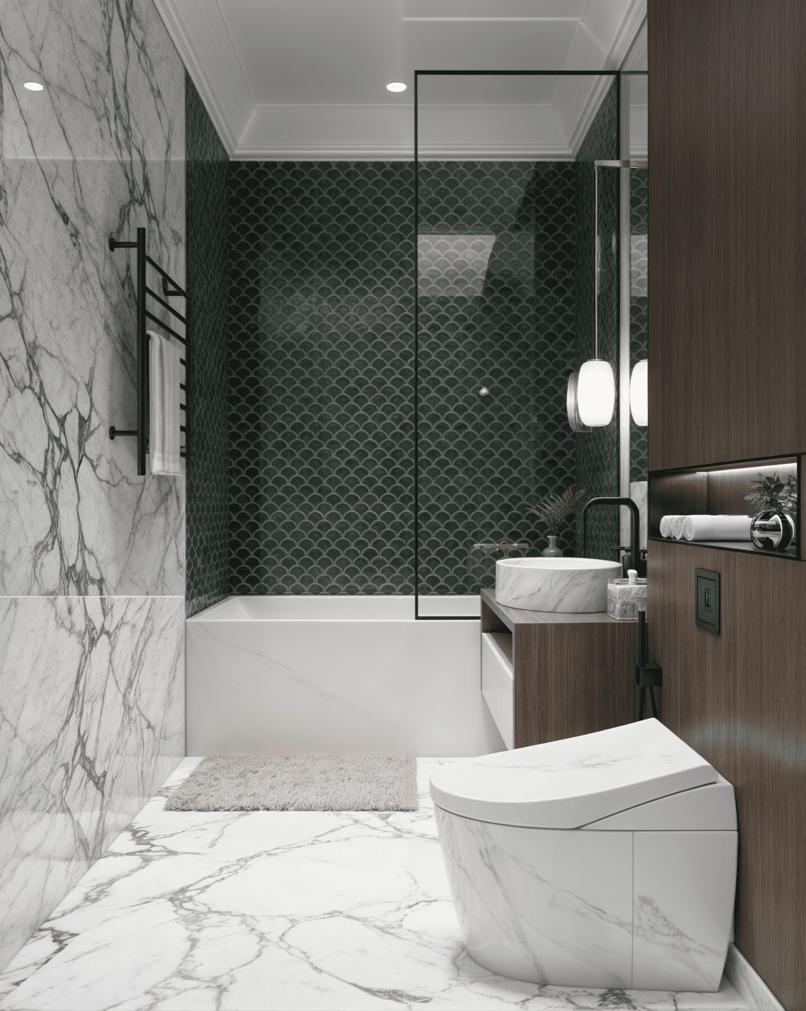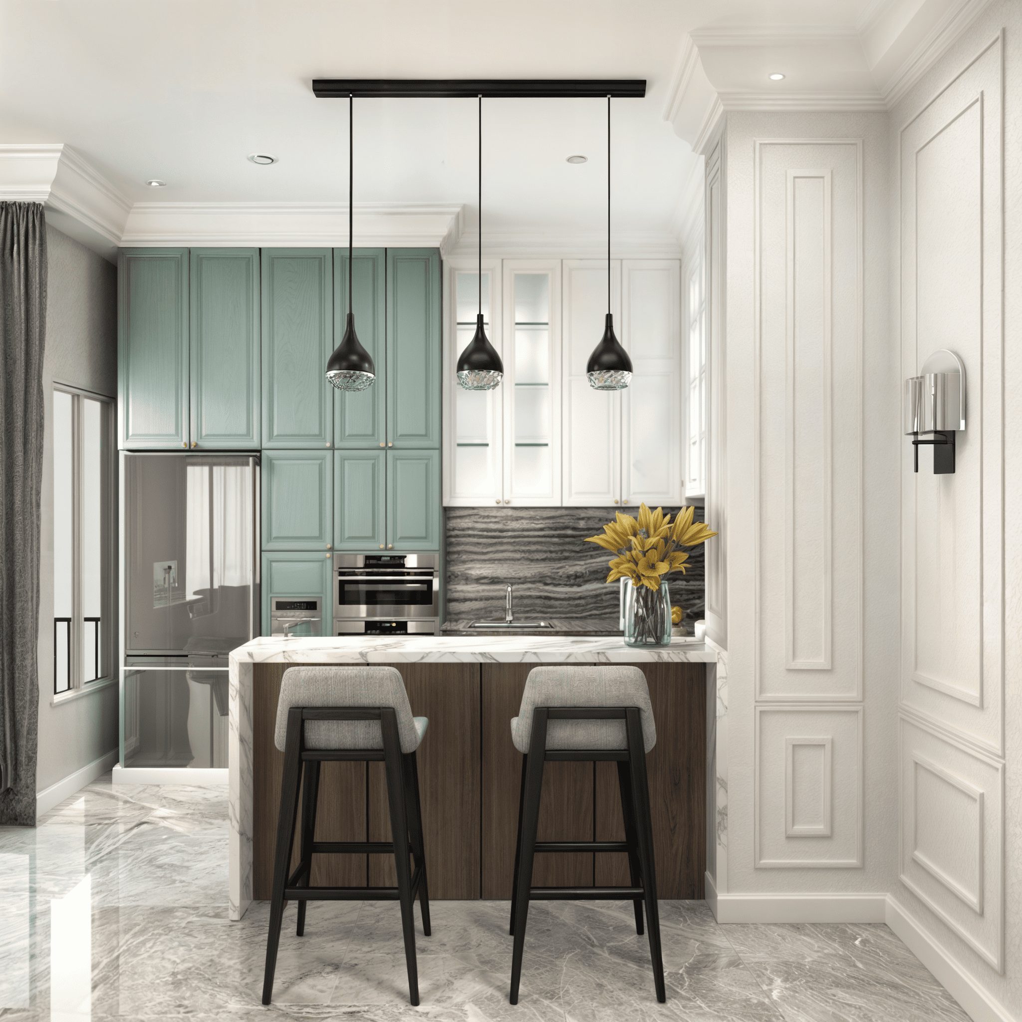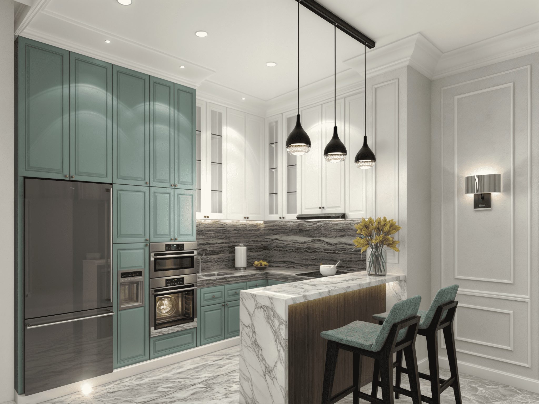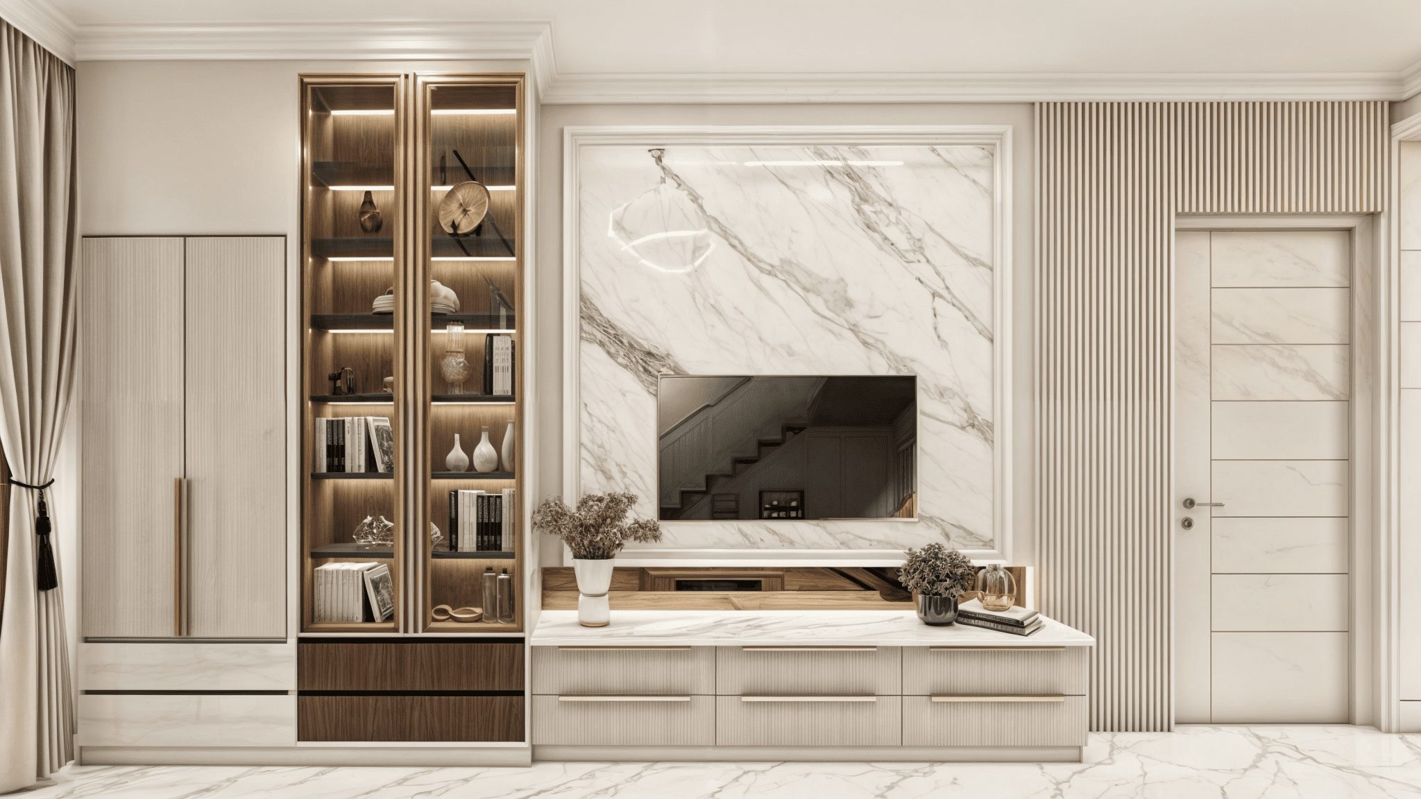 Melalui pendekatan 3D modeling realistis, tim kami berhasil menyatukan harmoni antar-ruang dan memastikan keseimbangan antara estetika serta efisiensi ruang. Material yang digunakan memadukan HDF duco lokal premium, marble motif lokal, serta warna tone netral dengan aksen emas. Sistem layered lighting diaplikasikan untuk menghadirkan atmosfer hangat pada malam hari.